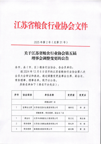 关于江苏省粮食行业协会第五届理事会调整变更的公告