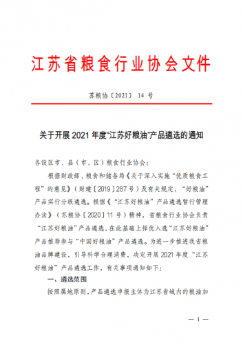 关于开展2021年度“江苏好粮油”产品遴选的通知