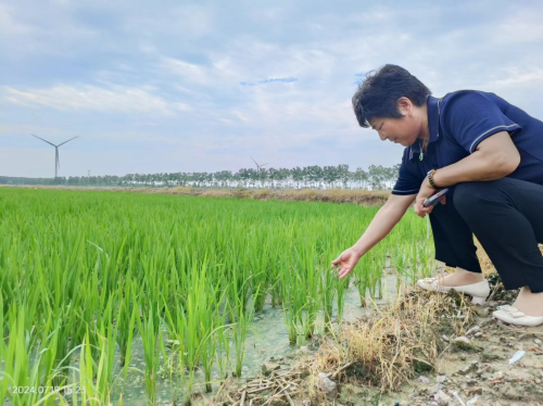 7月19日,贤人米业公司总经理成凤彩亲自来到基地考察。看着眼前绿意盎然的秧苗,成总难掩心中的喜悦。她俯下身子,抚摸着茁壮成长的秧苗儿,那份与大自然的亲近感令人动容。这不仅是对于工作的负责,更是对于土地和粮食的深情厚意。