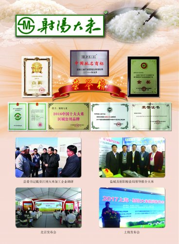 邓:2005年4月21日,“射阳大米”集体商标正式获准注册,成为我国大米类首件地理标志集体商标,是江苏当时唯一的地理标志集体商标。这标志着“射阳大米”从模糊的产品概念转换成了清晰的商品品牌,实现华丽转身。13年筚路蓝缕,13年玉汝于成,以时空为径、成果为纬,绘就出一幅“射阳大米”有声有色的壮丽画卷。“射阳大米”连续11年获得上海食用农产品“十大畅销品牌”,并成为中国十大大米区域品牌,获得2016国际农产品展销会金奖。中国品牌建设促进会2016年品牌价值评价结果,“射阳大米”品牌价值185.32亿元。2017年6月,“射阳大米”获得“中国最受消费者喜爱的100个农产品区域公用品牌”。9月,在第十五届中国国际农交会上,“射阳大米”被授予“2017全国农产品区域公用品牌”前100强称号,大米类排位第一。