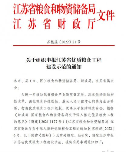 关于组织申报江苏省优质粮食工程建设示范的通知 苏粮规 〔2022〕21号.pdf