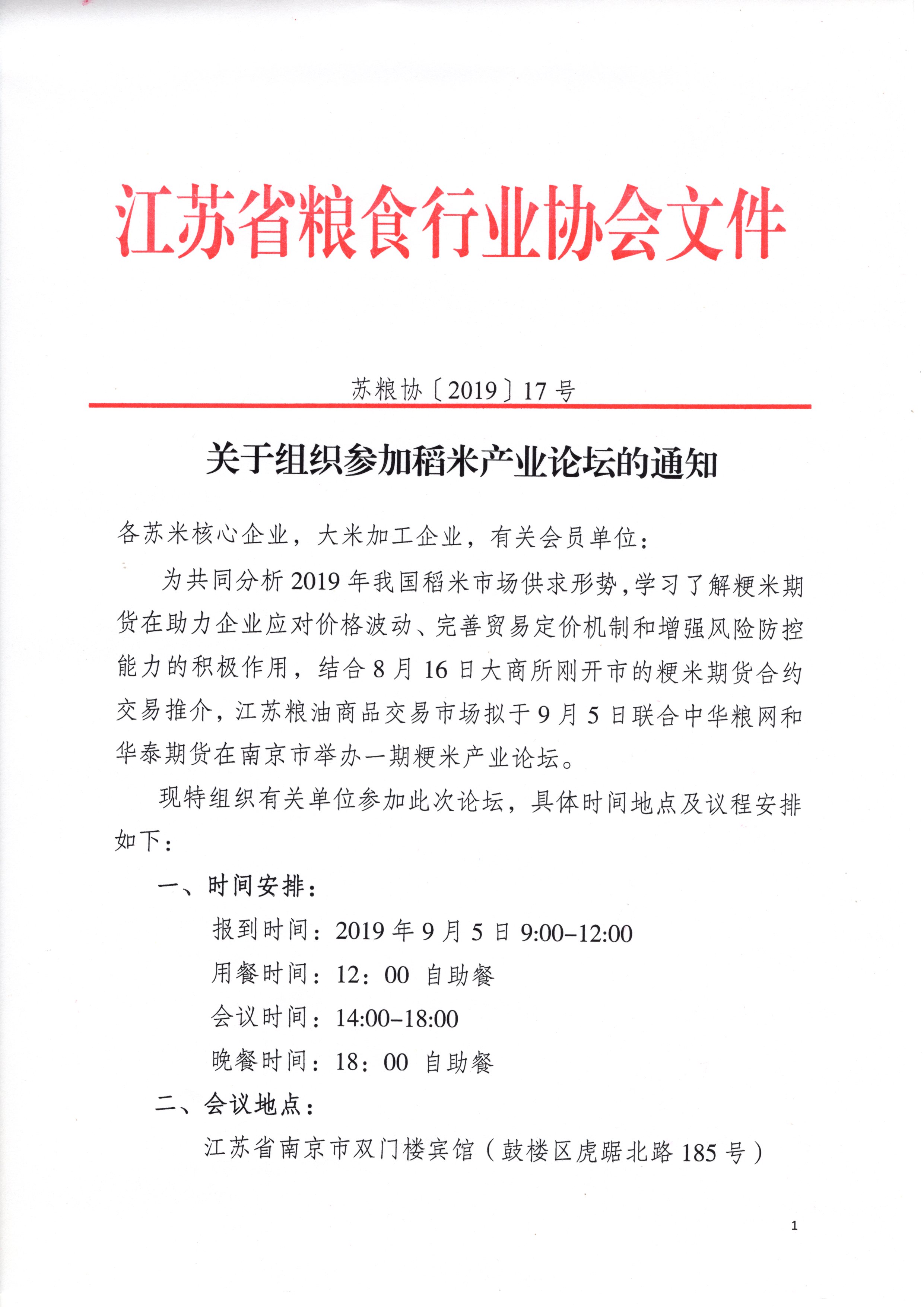 为共同分析2019年我国稻米市场供求形势,学习了解粳米期货在助力企业应对价格波动、完善贸易定价机制和增强风险防控能力的积极作用,结合8月16日大商所刚开市的粳米期货合约交易推介,江苏粮油商品交易市场拟于9月5日联合中华粮网和华泰期货在南京市举办一期粳米产业论坛。