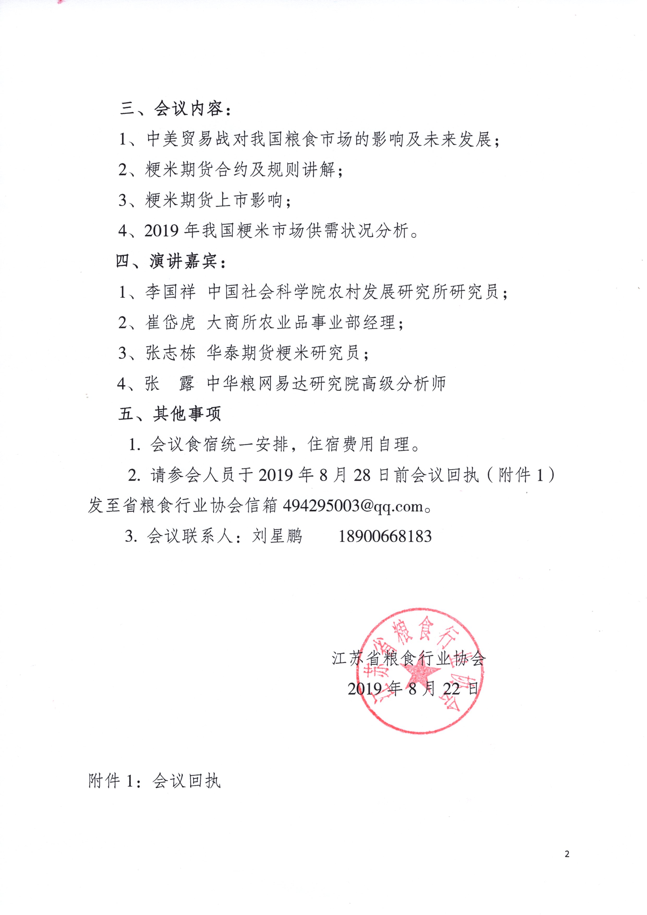 2. 请参会人员于2019年8月28日前会议回执(附件1)发至省粮食行业协会信箱494295003@qq.com。