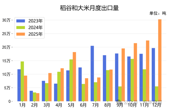 中国12月稻谷和大米出口量为30.27万吨,环比增加34.8%;同比增加448.84%。