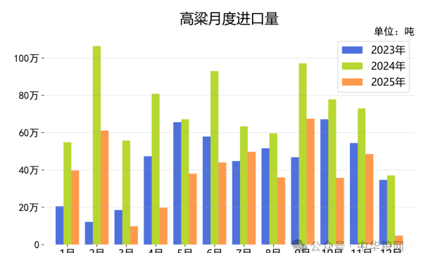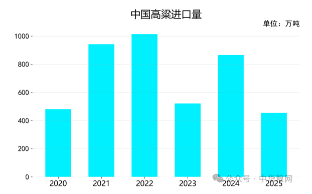 2025年1-12月高粱进口量共计454.43万吨,同比减少47.51%,其中进口来源地:澳大利亚为220.81万吨(48.59%)、阿根廷为152.59万吨(33.58%),其他合计81.03万吨(17.83%)。