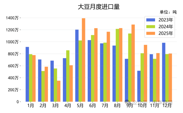 2025年1-12月大豆进口量共计11181.91万吨,同比增加6.46%,其中进口来源地:从巴西进口8232.82万吨(占比73.63%),同比增长10.3%;美国为1680.1万吨(15.03%),同比下降24%;从阿根廷进口789万吨,同比增长92.4%。