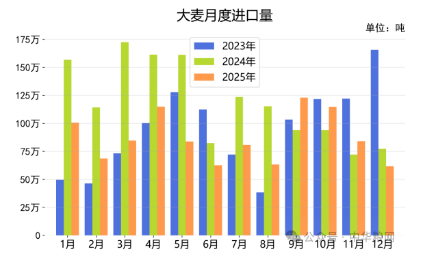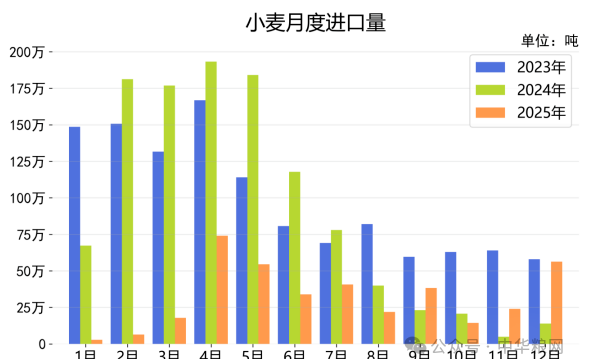 2025年1-12月小麦进口量共计385.08万吨,同比减少715.87万吨,减幅65.02%,其中进口来源地:加拿大271.26万吨(70.44%)、澳大利亚102.06万吨(26.5%),其他合计11.76万吨(3.06%)。