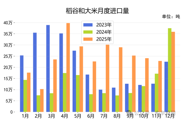 中国12月稻谷和大米进口量为35.9万吨,环比增加57.3%。同比减少4.22%。其中进口来源地:缅甸为14.46万吨(40.28%)、泰国为6.48万吨(18.06%)、越南为5.09万吨(14.19%)、柬埔寨为4.61万吨(12.84%),其他合计5.25万吨(14.63%)。