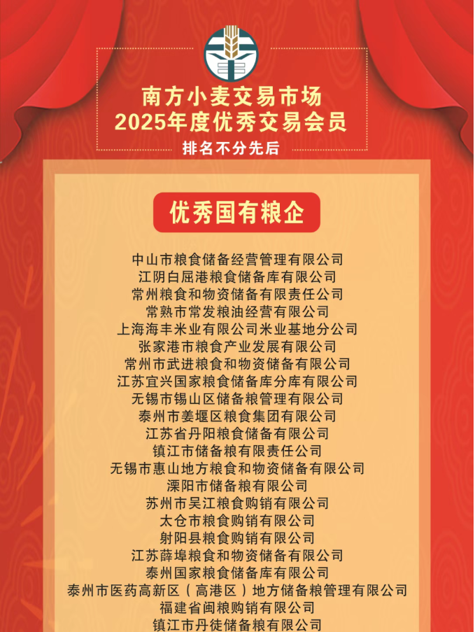南方小麦交易市场2025年度优秀交易会员评选名单出炉!