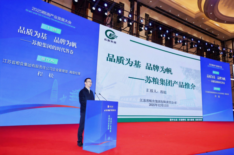 12月11日,由粮油市场报主办的2025粮油产业发展大会在武汉举行。来自全国各地的优秀粮油企业代表、业内专家学者、粮食行政管理部门负责人等,围绕“共铸安全根基同创产业辉煌”主题,通过专家演讲、企业推介等形式,以高级别的跨行业对话平台,通过企业精英、学界大家的思想交流与智慧碰撞,探讨中国粮油产业高质量发展、筑牢粮安根基的创新思路。江苏省粮食集团有限责任公司企业管理部高级经理程松以品质为基,品牌为帆——苏粮集团的时代答卷为题向与会人士作了分享。