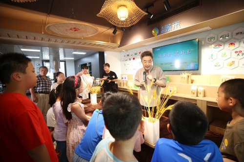 江苏农垦的“苏垦大米”现场煮饭,偌大一个旗舰店米香沁人;江苏省作家协会副主席祁智轻松幽默的演讲,让小记者们兴奋不已;江苏农垦米业品牌部副部长叶蕾介绍的“苏垦宝贝米”让孩子家长们期待不已;工作人员和小记者们一起制作米饮,大家竞相品尝、举杯共饮,孩子们感叹道“原来大米还能喝……”