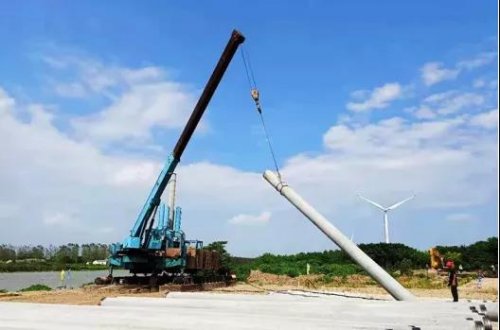 日前,江苏省盐城市大丰区三龙镇龙南村斗龙港河南岸,江苏省沿海农业发展有限公司“粮食科技产业园”项目码头施工现场,二十多根PHC管桩整齐排列,一台庞大的静压桩机稳坐河边,伴随着阵阵轰鸣,缓缓吊起10米长的管桩进行沉桩施工。不远处两个班组工人正头顶烈日,加紧进行钢筋预制、焊接作业。