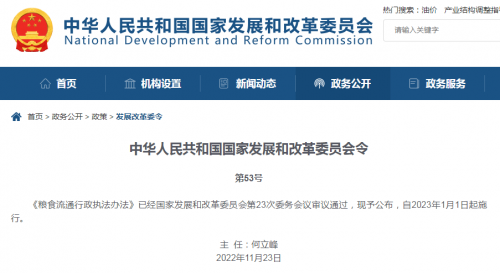 《粮食流通行政执法办法》已于2022年11月底发布,2023年1月1日起正式施行。《办法》全方位夯实粮食安全根基,规范粮食和物资储备行政管理部门粮食流通行政执法行为。
