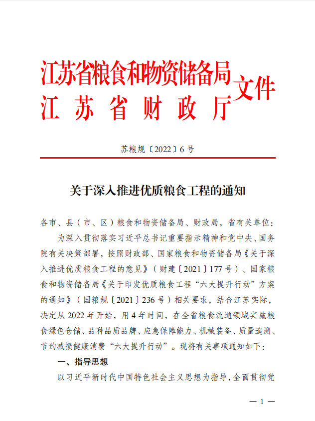 为深入贯彻落实习近平总书记重要指示精神和党中央、国务院有关决策部署,按照财政部、国家粮食和物资储备局《关于深入推进优质粮食工程的意见》(财建〔2021〕177号)、国家粮食和物资储备局《关于印发优质粮食工程“六大提升行动”方案的通知》(国粮规〔2021〕236号)相关要求,结合江苏实际,决定从2022年开始,用4年时间,在全省粮食流通领域实施粮食绿色仓储、品种品质品牌、应急保障能力、机械装备、质量追溯、节约减损健康消费“六大提升行动”。现将有关事项通知如下:
