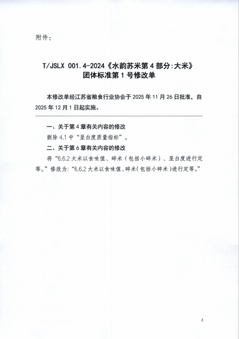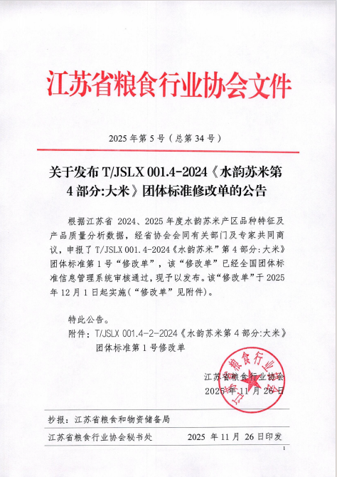 关于发布T/JSLX 001.4-2024《水韵苏米第4部分:大米》团体标准修改单的公告