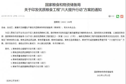 11月17日,国家粮食和物资储备局发布“十四五”时期实施优质粮食工程“六大提升行动”,到2025年,新增高标准粮仓仓容2000万吨,优质粮食增加量年均增长10%以上。